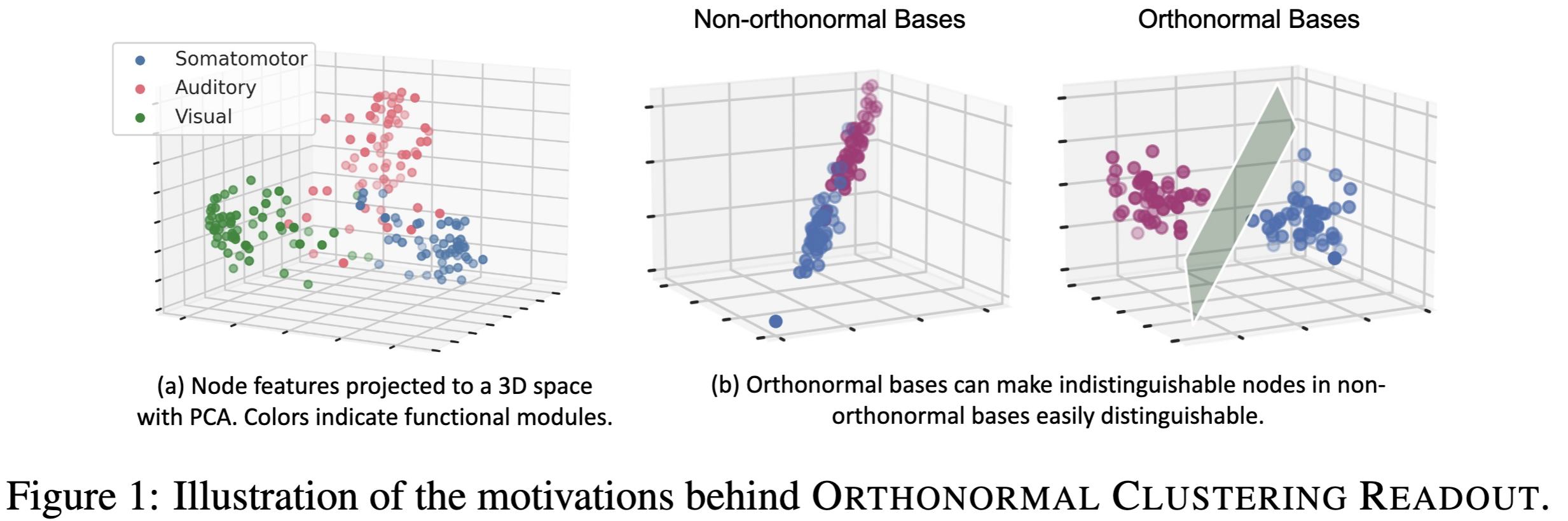 한 단계 나아가서 brain network analysis에 GNNs를 사용할 때는 학습된 node embedding을 기반으로 readout function을 통해 graph-level embedding을 생성해야 한다. brain network의 특성상 동일한 기능적 모듈에 속하는 노드들은 다양한 자극에 대한 활성화 및 비활성화 반응에서 유사한 행동 양식을 공유하는 경우가 많다. 이를 위해 ORTHONORMAL CLUSTERING READOUT을 설계하여 노드들의 cluster에서 graph-level embedding을 pooling한다.