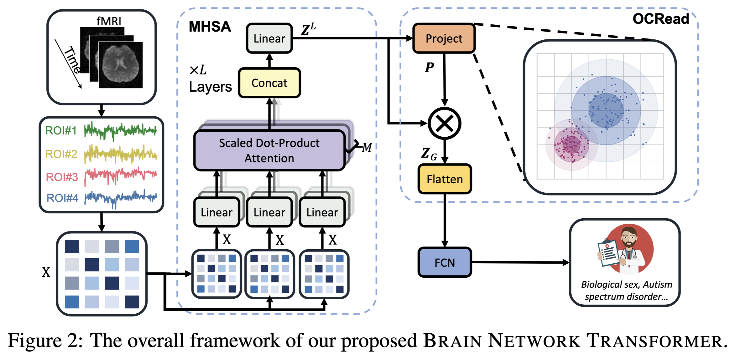 brain network analysis에서 brain network: $X \in \mathbb{R}^{V \times V} $ where $V$는 node (ROIs)의 수 이며 주로 성, 질병의 유무, brain subject의 특징을 예측하는 것이 모델의 주 목표이다. BNT의 전반적인 프레임워크는 아래 그림과 같다. $L$개의 MHSA layer와 graph pooling operator OCREAD로 두개의 main component로 이루어져있다.