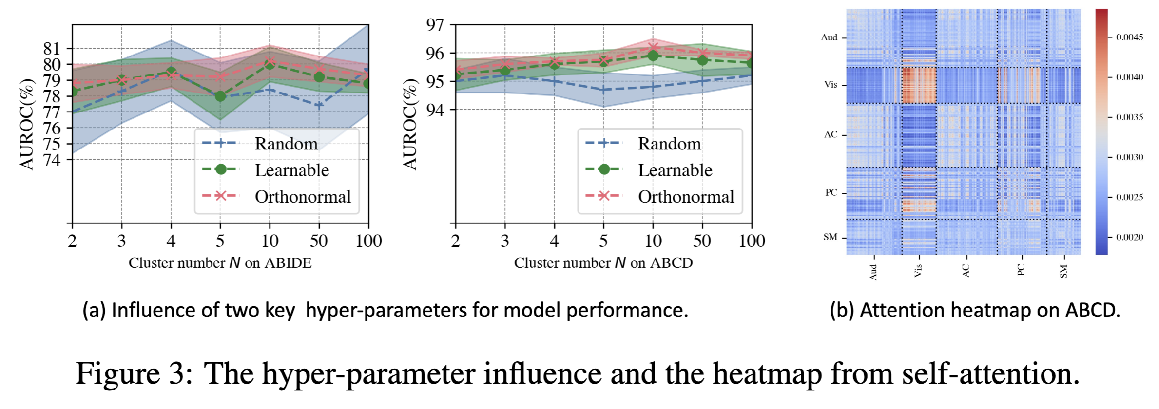 fig3(b)는 ABCD 테스트셋에서 MHSA 첫 레이어의 평균 self-attention score이다. 이는 학습된 attention score가 available labels 기반의 functional modules의 구분과 잘 일치하여 transformer 모델의 효율성과 설명 가능성을 보여준다. ABIDE는 label을 제공하지 않기 때문에 시각화하지 못했다.