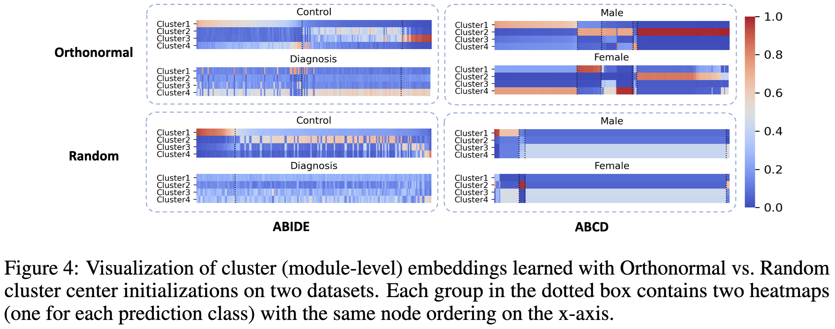 \[\begin{equation} P_{ik} = \frac{e^{\langle Z^L_{i\cdot},\, E_{k\cdot} \rangle}}{\sum_{k'}^{K} e^{\langle Z^L_{i\cdot},\, E_{k'\cdot} \rangle}}, \end{equation}\]soft assignment가 계산된 이후로 $Z^L$은 soft cluster information의 가이드를 받아 graph-level embedding $Z_G$로 집약된다. $Z_G = P^TZ^L$ 그러나 GT 없이 node embedding과 cluster를 학습하는 것은 어렵다. 따라서 클러스터 센터 초기화가 매우 중요하다. 이를 해결하기 위해 Fig1(b)에서의 관측을 활용한다. 이는 orthonormal(직교) embedding이 brain network내에서 node clustering을 향상시키는 것이다.