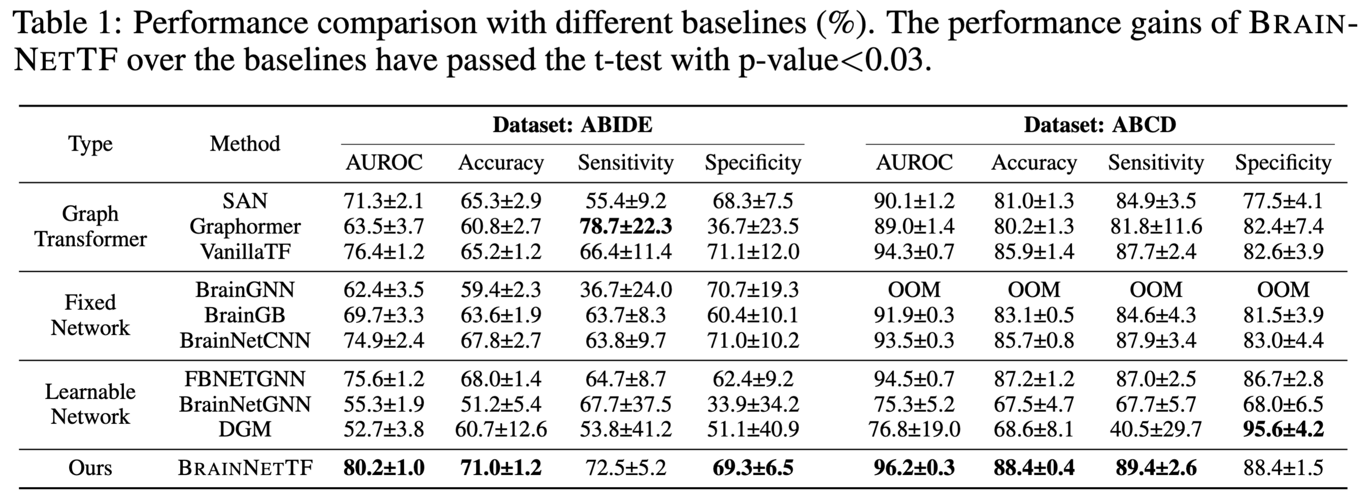 위 표를 보면 알 수 있지만 VanillaTF가 다른 비교군을 AUROC 측면에서 이겼다. 저자들은 이를 brain network의 특성 때문이라고 분석했다. 이는