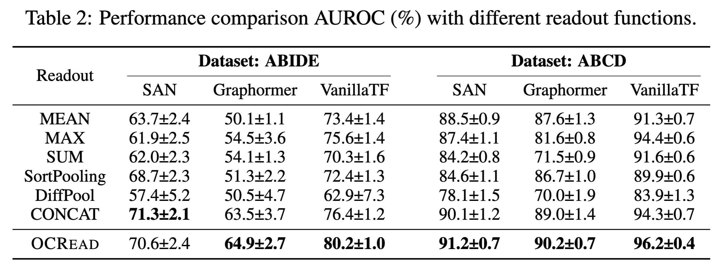 아래 표는 SAN, Graphormer and VanillaTF에 대하여 다양한 readout function과 본 논문에서 제안된 OCREAD를 비교한 표이다. 전반적으로 OCREAD가 가장 효과적인 readout function이었으며 다양한 transformer 아키텍처의 예측 성능을 높혀주었다.
