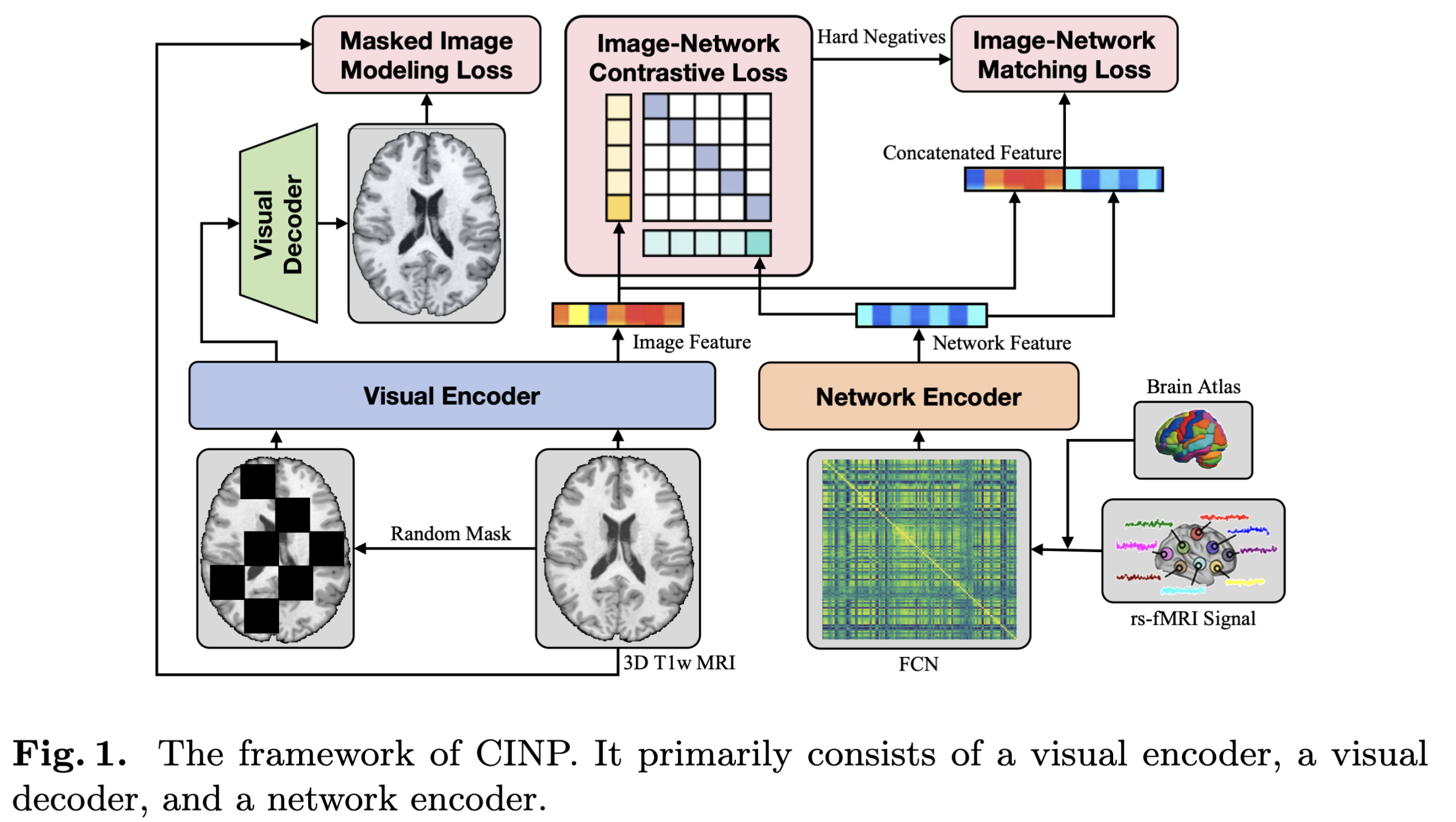 fig. 1에 명시되어 있듯 CINP는 visual encoder, visual decoder, network encoder로 구성되어 있다. visual encoder로는 Self-supervised pre-training of swin transformers for 3d medical image analysis 논문에서 weight로 초기화를 한다. 입력 3D T1w MRI 이미지 $I$는 전체 voxel의 30% 를 랜덤 마스크로 가려 masked MRI 이미지 $I^\ast$를 만든다. encoder를 통해 normalized image embedding $v_I$와 normalized masked image embedding $v^{\ast}_I$를 얻는다. (각 768D) visual decoder는 위의 언급한 논문의 구조를 따르며 $v^{\ast}_I$를 $\hat I$로 reconstruct 한다. Brain Network Transformer(BNT)를 network encoder로 사용하며 이는 FCN을 768 D의 normalized network embedding $w_N$로 인코딩한다.