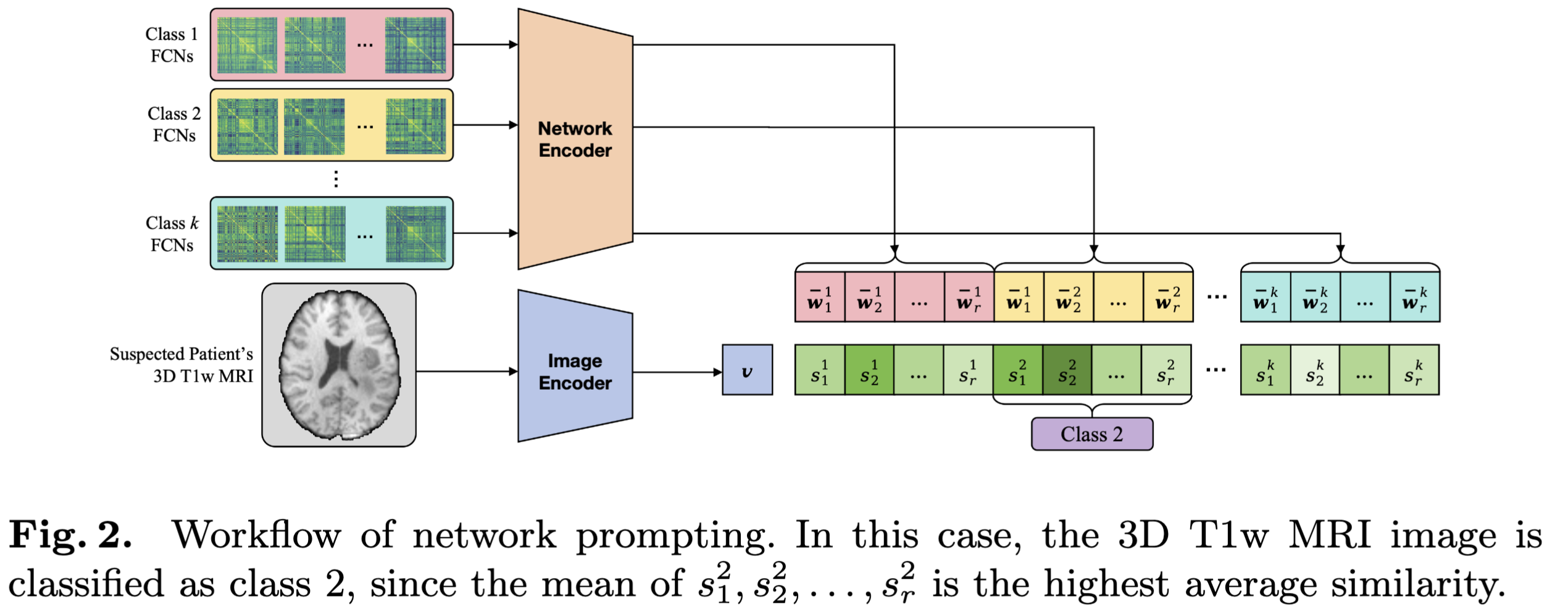 기존의 연구들은 linear probe나 fine-tunning을 사용하여 downstream task에 사용한다. 이는 많은 양의 annotated data를 요구하는데, fMRI는 정기적으로 수집되지 않는 문제가 있다. 저자들은 이 문제를 해결하기 위해 서로 다른 subject에서 FCNs이 significant한 group-level 차이를 보이는 것에서 영감을 받아 network prompting을 사용한다(fig. 2). 이들은 pre-trained CINP가 3D T1w MRI 이미지 embedding과 FCN embedding이 공동의 semantic space에서 학습됐기에 이들의 similarity를 측정할 수 있다는 가정을 한다.