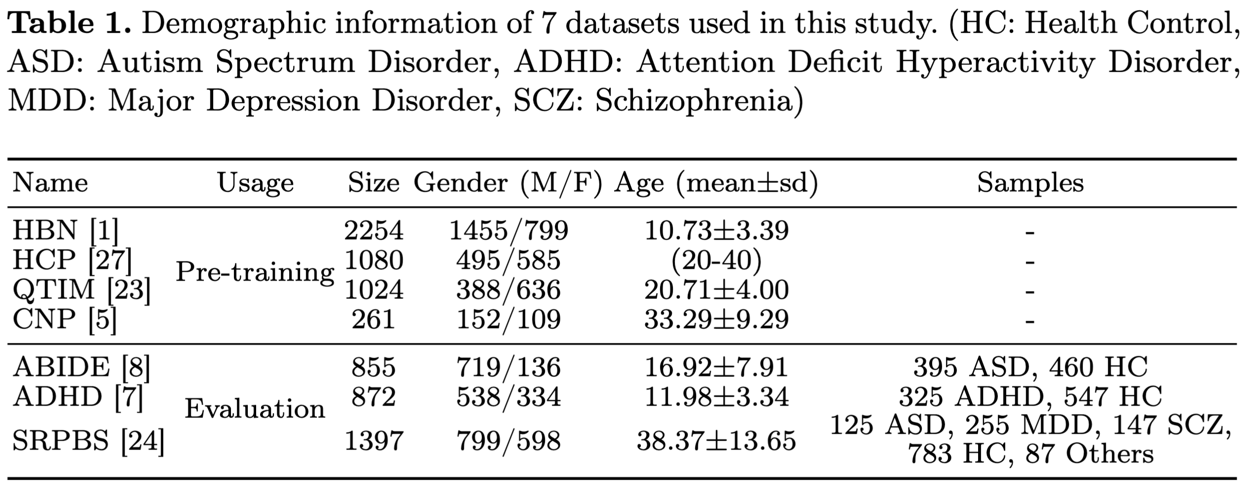 저자들은 공공 데이터를 이용하여 3D T1w MRI and resting-state fMRI (rs-fMRI) 데이터셋을 구성했다. 4개의 데이터셋을 pre-training에 사용한다(HBM, HCP, QTIM, CNP). evaluation에는 ABIDE, ADHD, SRPBS의 세개의 데이터셋을 이용한다. fMRIPrep preprocessing pipeline을 이용하여 전처리 했으며 모든 mri의 복셀 크기는 $2\times2\times2 mm^3$로 preprocessing 되었다. rs-fMRI로부터 FCNs를 뽑기 위해 116개의 ROIs를 가진 AAL atals를 피어슨 상관계수로 사용했다. 자세한 데이터에 관한 설명은 아래 표를 참고하면 된다.