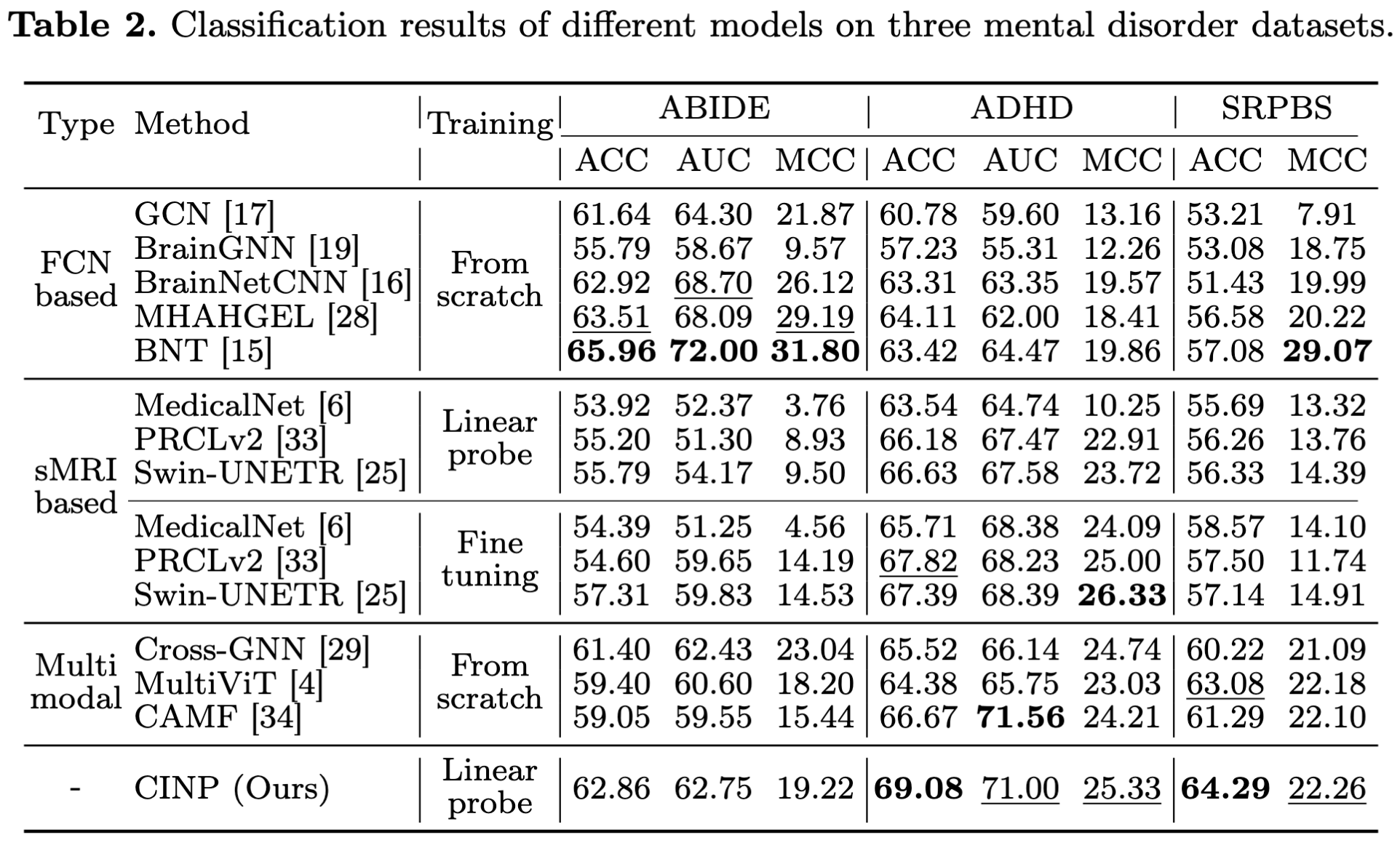 본 논문에서 저자들은 3D T1w MRI와 FCN을 contrastive learning하는 framework인 CINP을 소개한다. mental disorder diagnosis의 성능을 향상시키기 위해 pre-training 하는 동안 3개의 loss가 3D T1w MRI image의 representation 품질을 FCN supervision으로 향상시켰다. 또한 network prompting을 도입함으로 적은 양의 FCN으로 환자가 sMRI만 촬영하여 예측에 사용하는 것이 가능하도록 한다. 3개의 데이터셋에서 CINP의 효과를 입증하였으며 sMRI를 임상 진단에 통합하는 것에 대한 가능성을 보여준다.