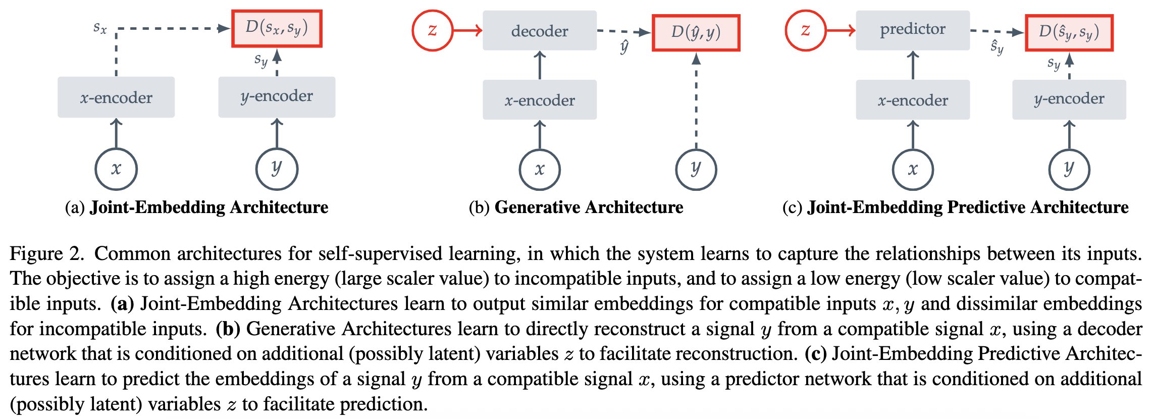 Figure 2c.에서 볼 수 있듯이 Joint-Embedding Predictive Architectures는 Generative Architectures와 비슷하다. 이와 가장 큰 차이는 loss 계산이 input space가 아닌 embedding space에서 일어나는 것이다. JEPAs는 예측을 용이하기 위한 변수 $z$를 조건으로 받아 compatible signal $x$로 부터 signal $y$의 임베딩을 예측 네트워크를 통해 예측하도록 학습한다. 자세한 그림은 Figure 3.을 참조하면된다.