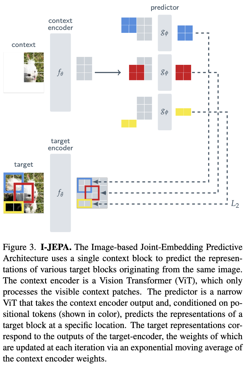 본 논문에서는, I-JEPA라는 추가 사전 지식 없이 self-supervised representations의 semantic 수준을 높이는 method를 도입한다. I-JEPA의 핵심 아이디어는 abstract representation space(추상 표현 공간)에서 누락된 정보를 예측하는 것이다. 예를 들어 같은 이미지의 단일 context block를 주고, 여러 target block의 representation을 예측하는 것이다.