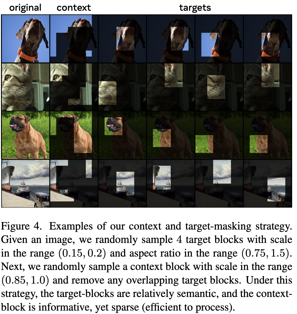 주어진 입력 이미지 $y$를 겹치지 않는 N개의 패치를 만든다. target-encoder $f_{\bar \theta}$에 이걸 넣어서 대응하는 patch-level representation $s_y=\lbrace s_{y1},…, s_{yN} \rbrace $을 만든다. loss를 위한 targets를 얻기 위해 $s_y$에서 M개의 랜덤한 sample block을 뽑는다. i번째 블록에 대응하는 마스크를 $B_i$로 표시하고 $s_y(i) = \lbrace s_{yj} \rbrace _{j \in B_i}$로 표시한다. 저자들은 실험에서 M=4로 셋하고 0.75:1의 종횡비와 0.15~0.2의 스케일로 block을 샘플링했다.
