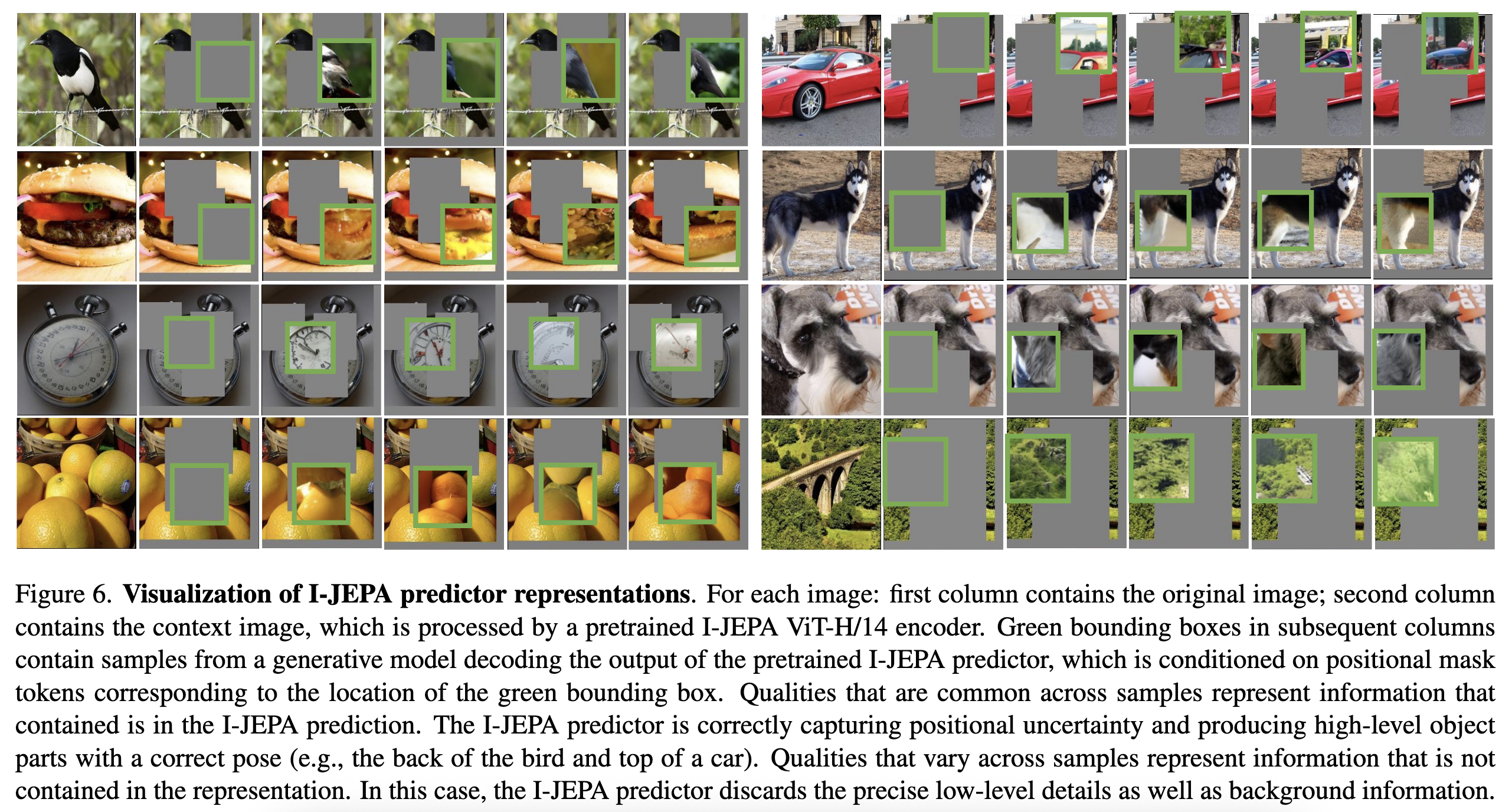 I-JEPA로 학습한 모델을 RCDM framework로 생성을 시킨 결과이다. I-JEPA의 predictor는 고수준 object의 부분을 정확한 Pose로 잘잡아낸다.