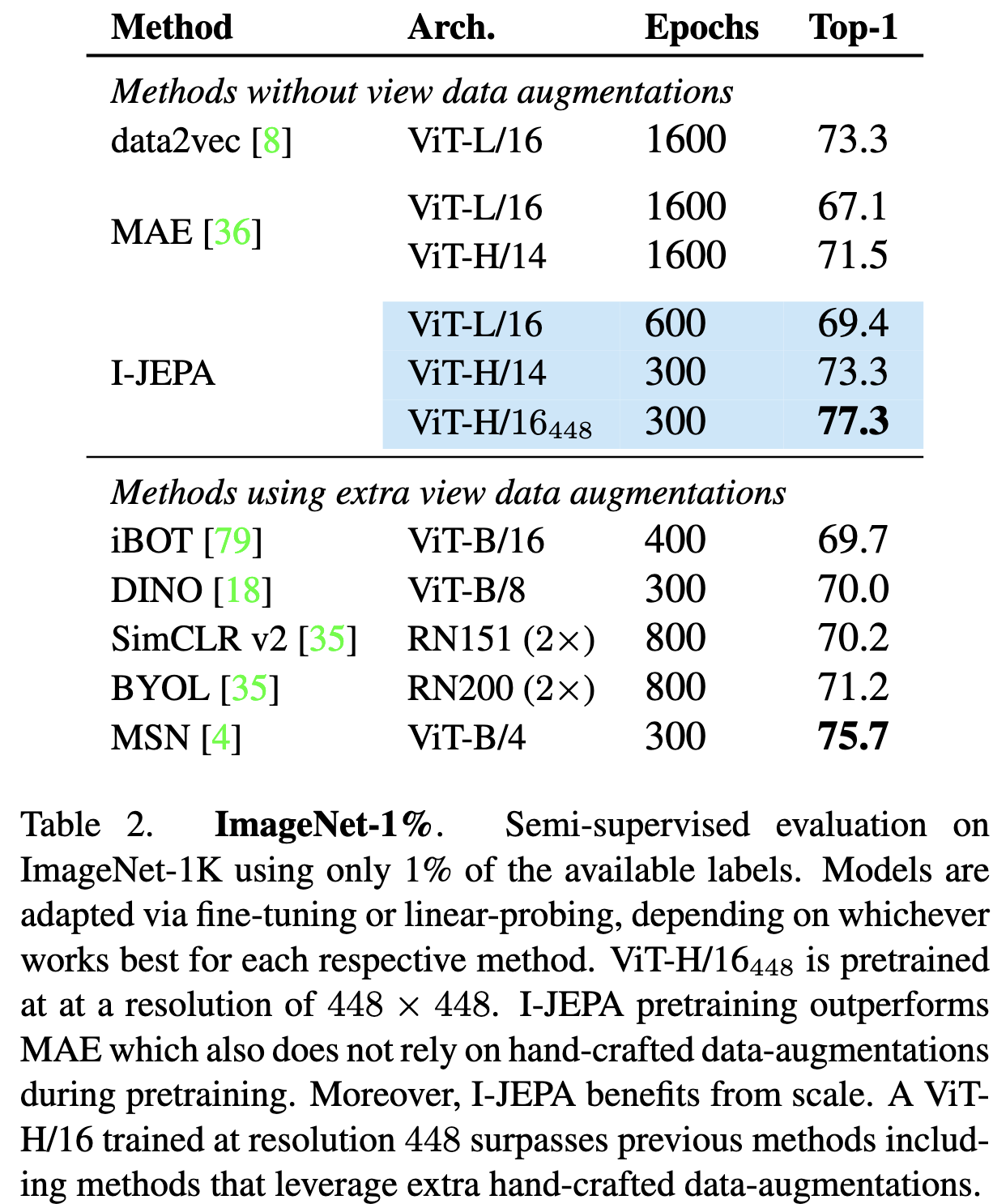 IN1k의 1%(각 클래스 별로 12~13 장)으로 학습한 결과이다. 적은 에폭으로도 비슷한 구조의 MAE보다 나은 성능을 보였다. 이미지 해상도가 높아져도 JEAs보다 더 나은 성능을 보인다.