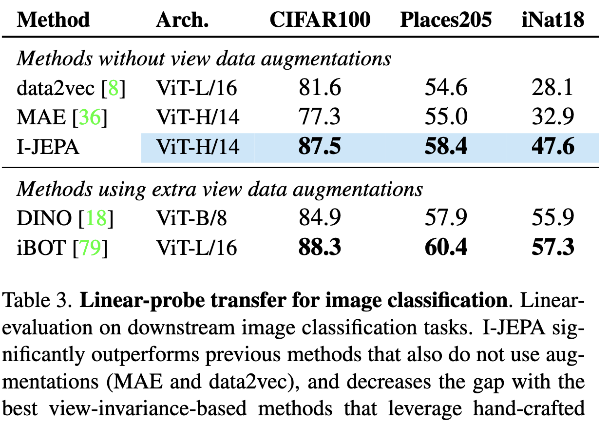 hand-crafted augmentation을 사용하지 않는 다른 유명한 방법인 MAE, CAE 그리고 data2vec과 비교했을때 I-JEPA는 더 적은 연산으로 linear probing 성능을 향상시켰다.