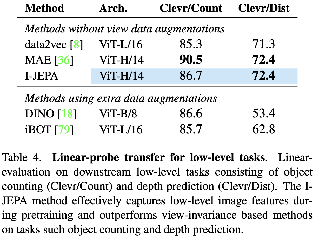 - 에서 I-JEPA의 강력함을 엿볼 수 있었는데 이 섹션에서는 I-JEPArk local image feature를 학습하고 low-level이고 dense prediction task에서 view-invariance based method보다 더 나은 결과를 보임을 입증한다.
