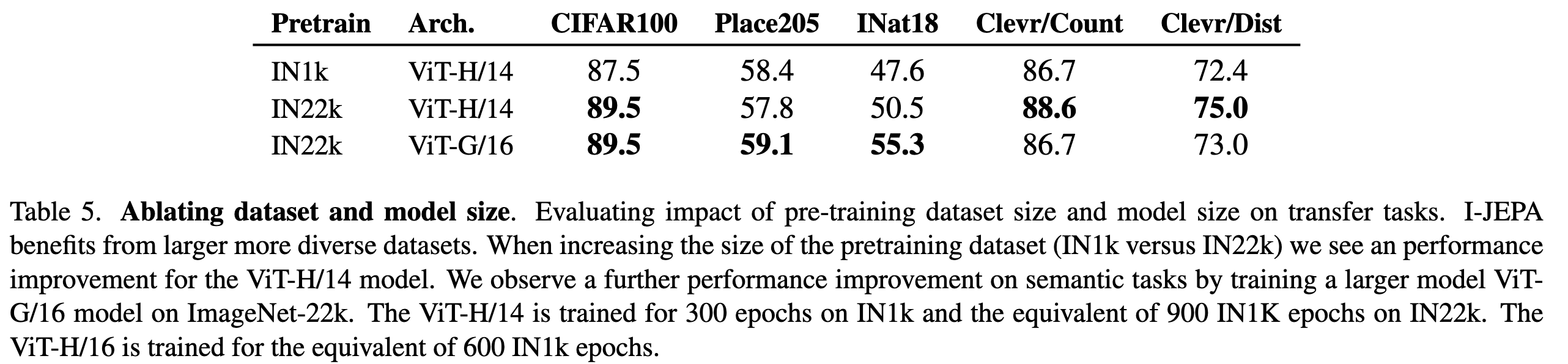 I-JEPA는 더 큰 데이터셋에서 pretraining할 때 효과적임을 아래 표를 통해 확인할 수 있다.