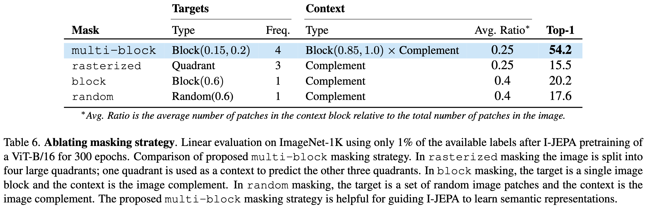 I-JEPA를 더 semantic representations을 생산하도록 선택된 또 다른 핵심 디자인은 multi-block masking strategy이다. 특히 이미지에서 충분히 큰 target blocks를 예측하도록 하는 것의 중요성을 입증한다.