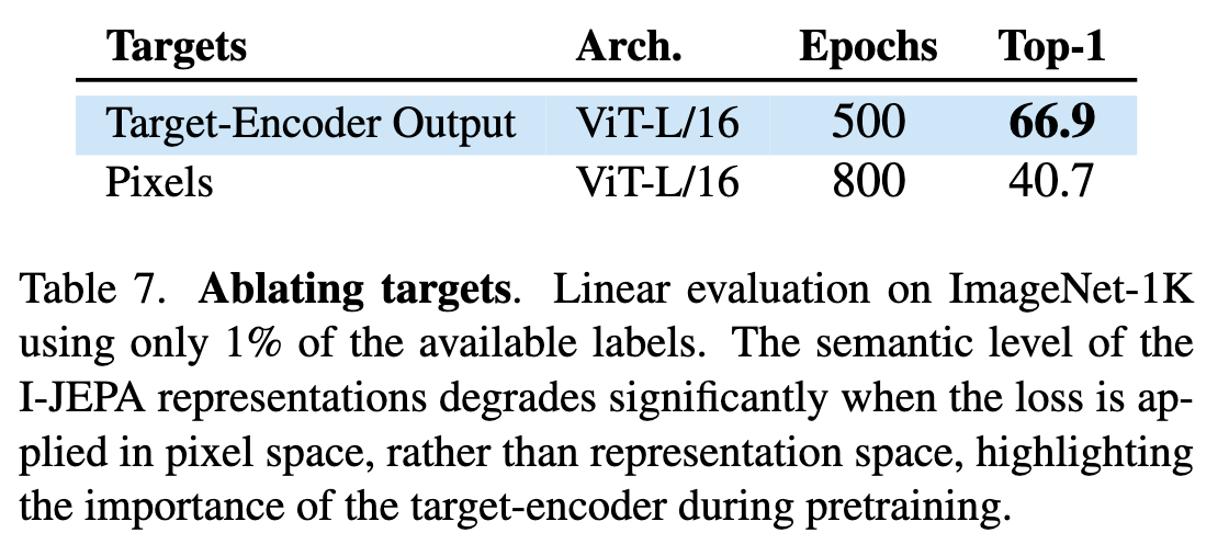 pixel space에서 예측하게 되면 모델이 픽셀 수준의 세부 정보(텍스처, 조명, 노이즈 등)까지 다 맞춰야 해서 representation이 low-level detail에 오염된다. 그러나 representation space에서 예측하게 되면 target encoder가 추상적인 예측 타겟을 만들 수 있으므로 의미없는 픽셀 수준 디테일이 제거된 상태로 학습된다.