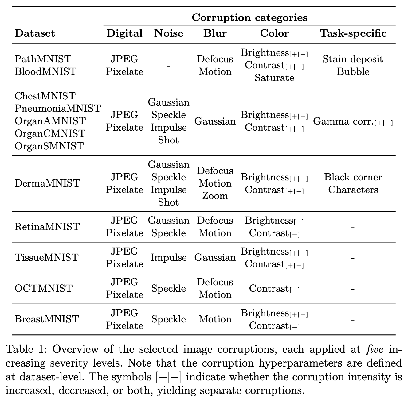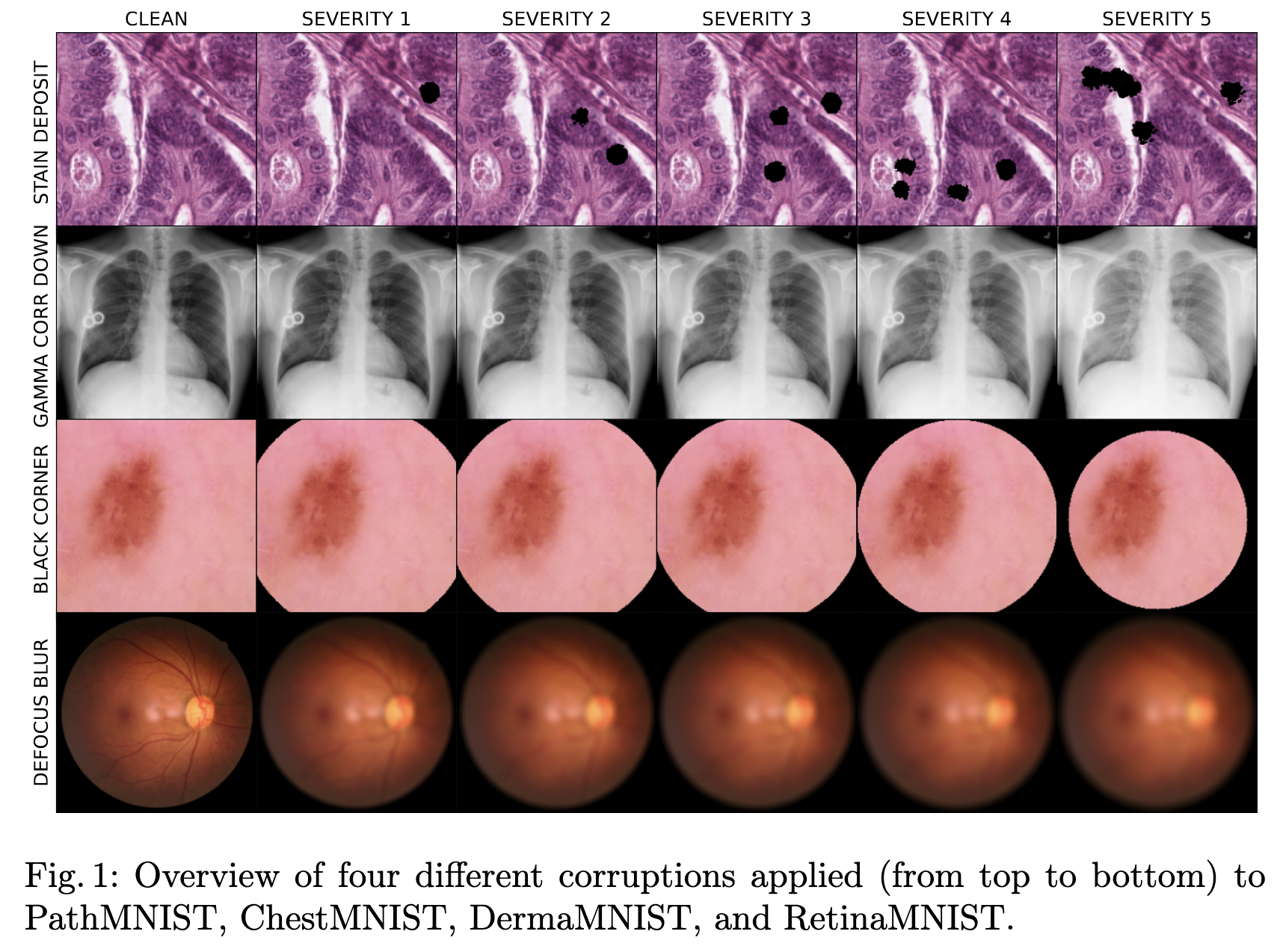 아래 표에 요약 되어 있듯이 저자들은 digital, noise, blur, color, and task-specific의 5개의 카테고리들로 corruption을 분류하여 MedMNIST+ 데이터셋(test)에 적용했다. 이때 ImageNet-C을 따라 5개의 severity 단계로 지정했다.