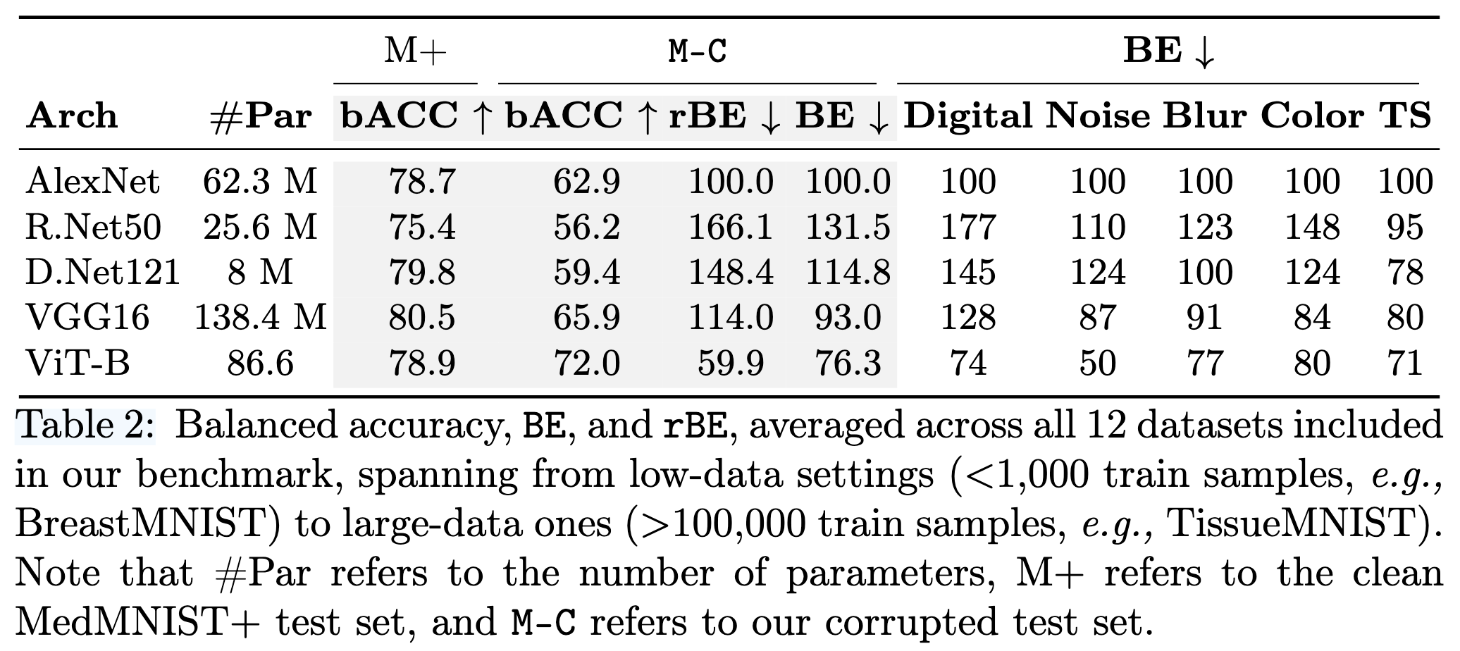 이 섹션에서는 target-specific corruptions이 주로 사용되는 모델에서 얼마나 효과적인지 확인한다. AlexNet(baseline), ResNet50, DenseNet121, Vit-B/16, VGG16을 비교한다. 이때 모델은 ImageNet으로 pre-trained되었으며 각각의 MedMNIST+에서 학습한다. 학습 조건은 다음과 같다.