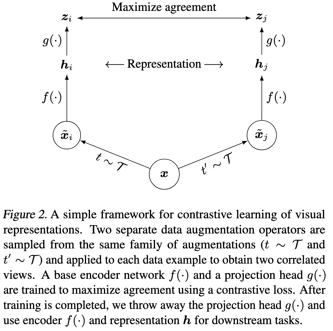 모델은 정말 간단하다. 구현의 간소화를 위해 encoder $f(·)$는 ResNet을 활용했다. 우리는 방금 한 말을 $h_i=f(\tilde{x}_i)=ResNet(\tilde{x}_i)$로 간단히 표현할 수 있는데, 이때 $h_i \in \mathbb{R}^d$는 avg pooling layer 이후의 출력이다. fig2를 보면 Projection head $g(·)$를 볼 수 있는데 이는 그냥 간단한 MLP다 이를 통해 우리는 $z_i$를 얻을 수 있고 $z_i=g(f(\tilde{x}_i))=W^{(2)}\sigma(W^{(1)}h_i)$로 표현할 수 있다. 여기서 sigma는 ReLU를 의미한다.