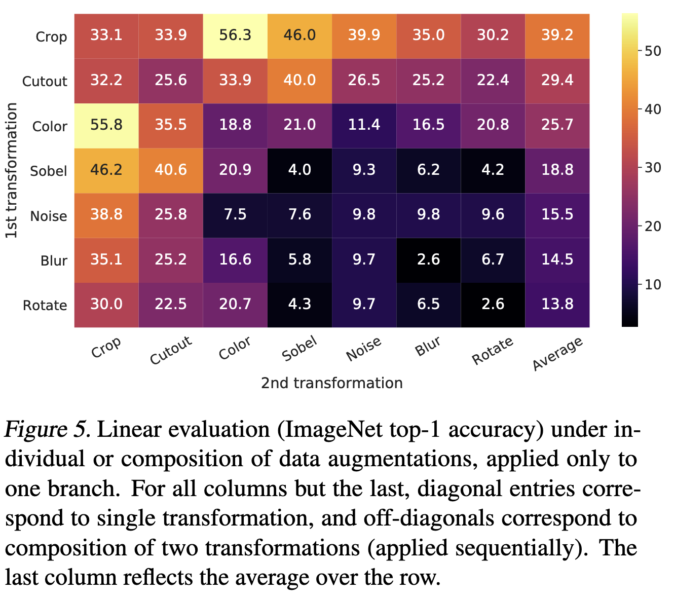 이들 중 최적의 조합을 찾기 위해 ablation study를 했다. 다음 그림에 의하면 Crop+Color distortion 전략이 ImageNet 1k linear probing에서 가장 높은 정확도를 기록했다. 우선 하나의 augmentation만 하면 좋은 representation을 얻지 못했으나 두개의 augmentation을 조합하면 식별은 좀 어렵지만, representation의 품질이 드라마틱하게 향상된다.