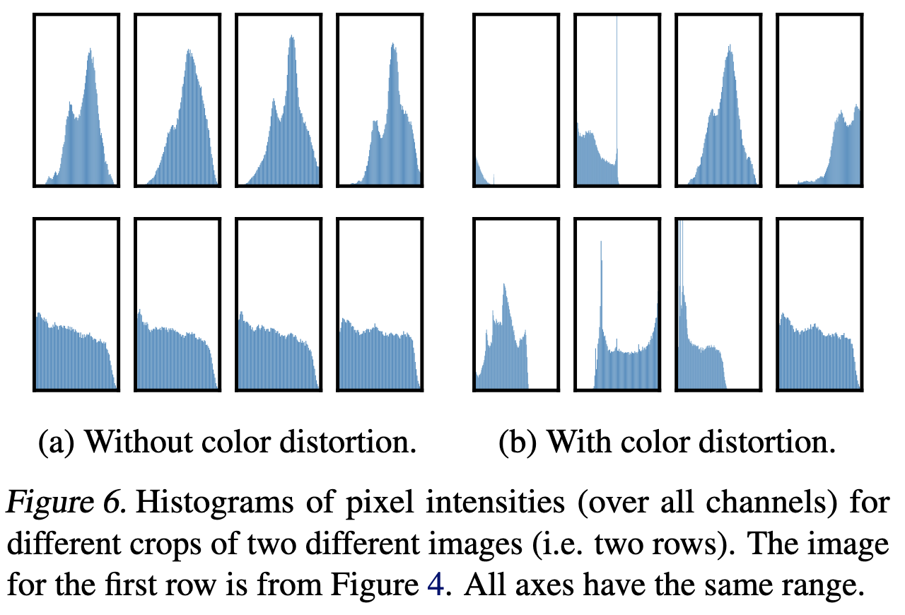 저자들이 분석한 이유로는 crop만 하면 대부분의 patch가 비슷한 색상 분포를 가지게 되는데 그것만으로도 충분히 네트워크가 식별 할 수 있었기 때문에 crop별로 color distortion을 다르게 적용하는 것이 더 높은 일반화 성능을 가질 수 있다고 설명한다.
