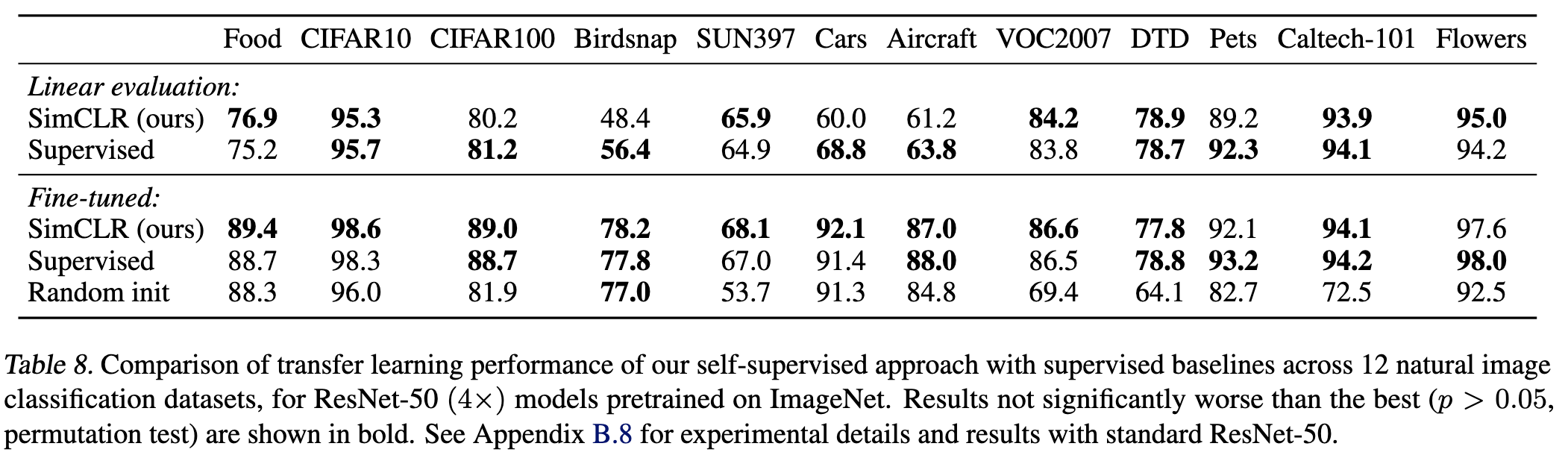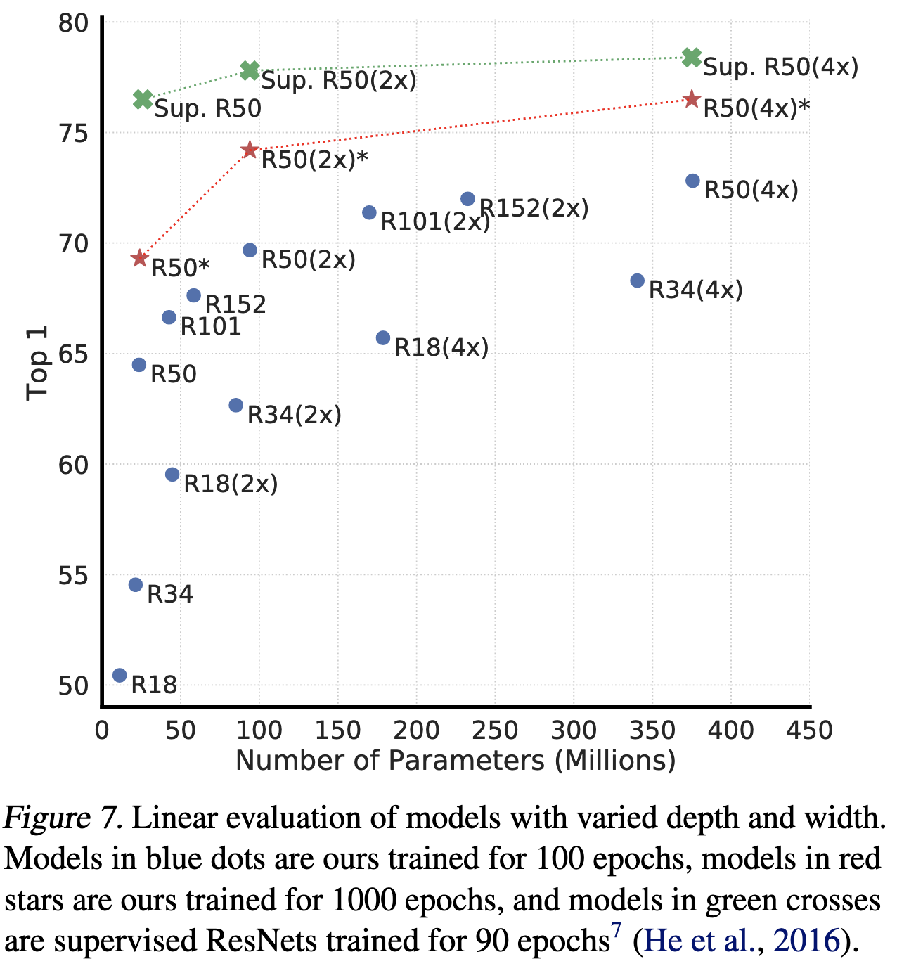 당연하게도 model이 넓고 깊을수록 성능에 영향을 받는다. 아래 그림을 보면 supervised learning보다 contrastive learning이 더 큰 영향을 받는 것을 알 수 있다.