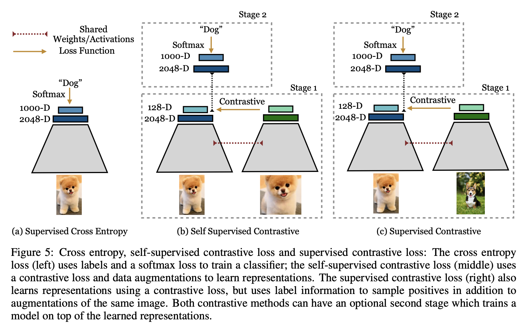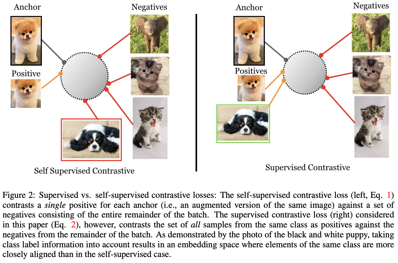 이 논문에서는 레이블 정보를 활용하여 Contrastive SSL에 기반한 지도 학습을 위한 loss를 제안한다. SSL에서는 같은 class더라도 다른 이미지면 negative로 밀어버리는 한계가 있었다. 그러나 SupCond에서는 같은 class에서 나온 Normalized embedding들 끼리는 당기고, 서로 다른 class에서 나온 Normalized embedding끼리는 밀어버린다(Fig. 2 참고). 이 Loss는 triplet Loss와 N-pair Loss의 일반화된 것으로 볼 수 있다. 각 anchor에 많은 positives와 negatives를 사용하는 것으로 hard negative mining(모델을 가장 헷갈리게 만드는 negative만 골라서 집중적으로 학습시키는 전략) 없이 SOTA를 달성 할 수 있었다. 이는 Large scale classification에서 CE보다 더 나은 성능을 보여준 contrastive loss를 Supervised learning에 사용한 첫 사례이다.