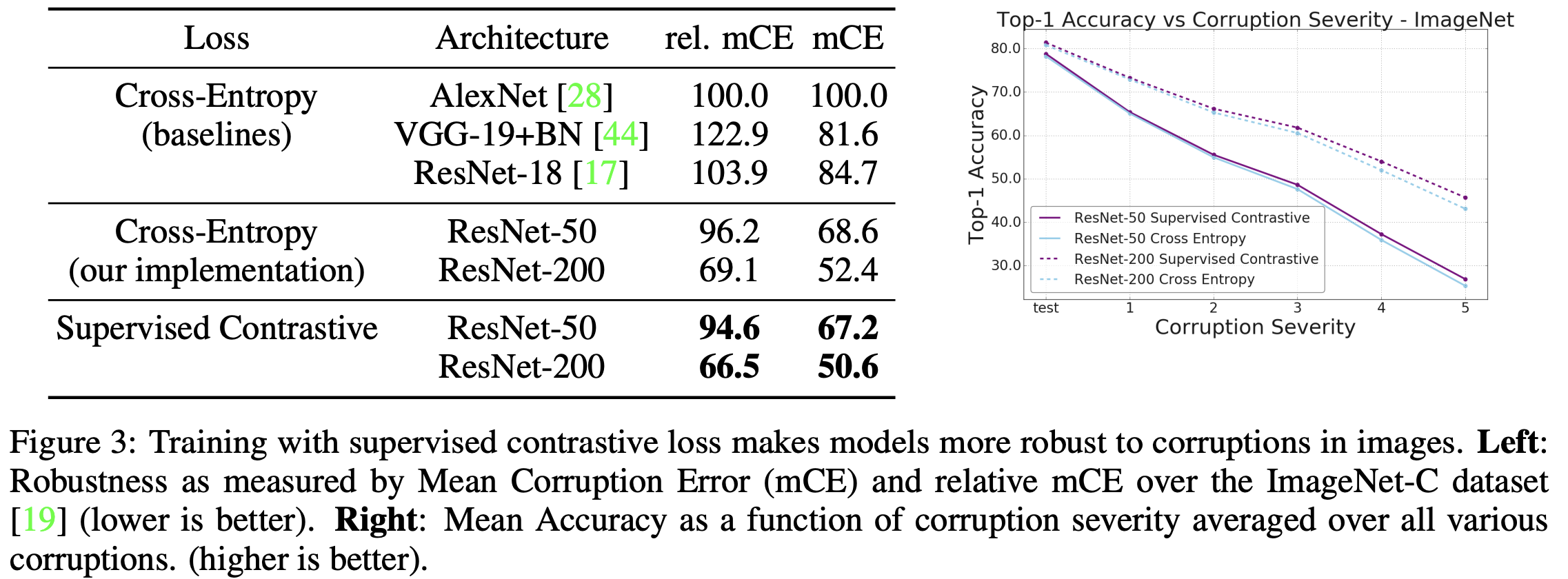 - SupCon의 성능은 여러 데이터셋에서 SOTA 급이며 natural corruptions에 robust하다.