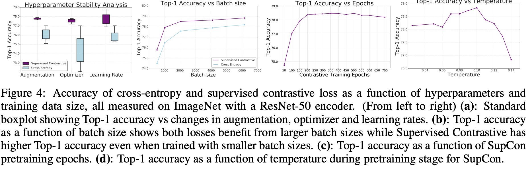 위 그림은 augmentations, optimizers and learning rates의 다양한 hyperparameter에 대하여 같은 batch size에서 CE와 비교한 결과이다. SupCon은 hyperparameter에 크게 구애받지 않고 안정적인 모습을 보여준다.
