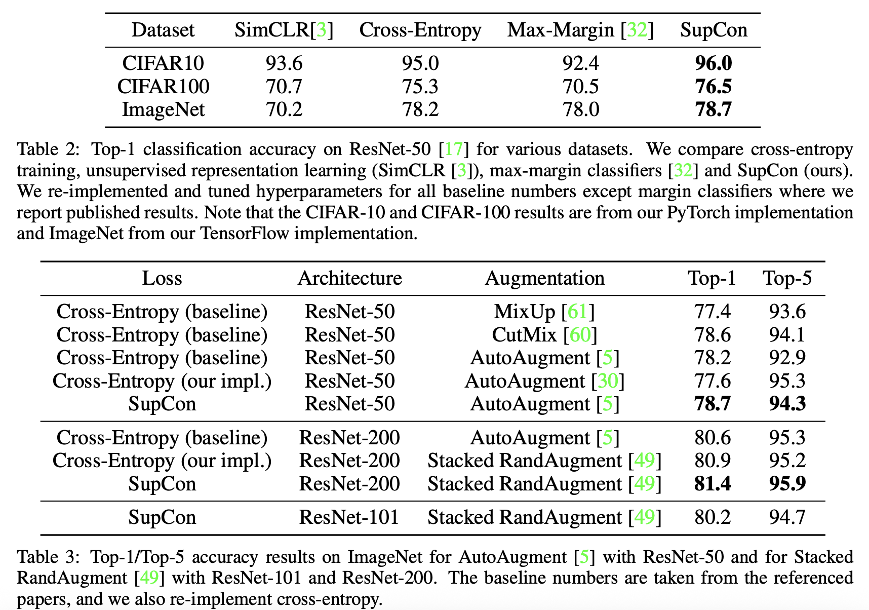 인코더는 보통 자주 쓰이는 resnet-50,101,200($D_E = 2048$) 세가지를 통해 비교했으며 Augmentation 전략으로는 AutoAugment, RandAugment, SimAugment, Stacked RandAugment 네가지를 사용했으며 resnet-50에서 SupCon과 CE 모두에서 AutoAugment 전략이 가장 성능이 좋았다. Stacked RandAugment는 resnet-200에서 성능이 제일 좋았다. (자세한 성능은 아래의 table 참고)