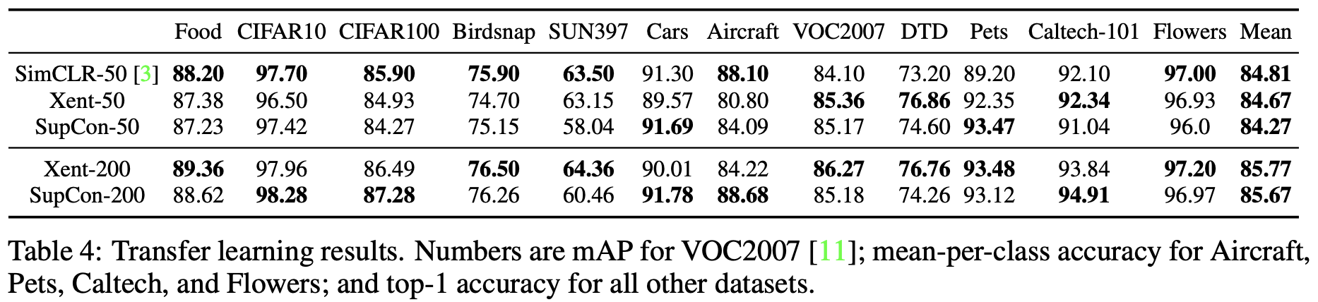 N-pairs loss도 N=6144로 실험했지만 57.4%로 성능이 좋지는 않았다. 저자들은 SupCon이 multiple views, lower temperture 그리고 더 많은 positives를 사용했기 때문에 더 나은 결과를 달성했다고 설명한다.